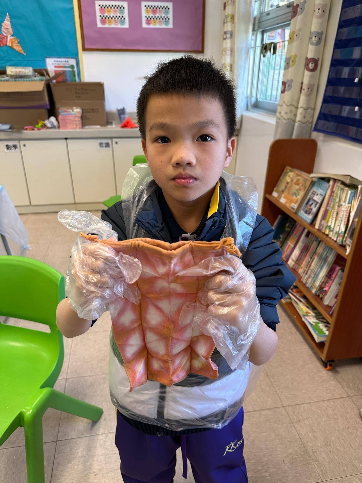 接著,大家動手為小布袋紮出喜愛的形狀,放入染液後,驚歎於布袋上浮現的顏色與圖案!